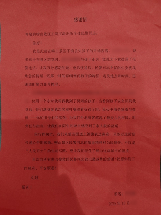 今年“十一”小长假期间,王哥庄派出所接到江苏游客陈先生的紧急求助电话,称其携家人至崂山游玩期间,10岁的女儿不慎走散,情况紧急,请求警方协助。接警后,值班民警迅速响应,第一时间赶赴现场,与家属一同沿登山路线展开细致搜寻。与此同时,派出所综合指挥室同步启动研判协调,全力查找女孩行踪。经过一个小时的紧张搜寻,民警最终在几公里外的雕龙嘴附近成功找到了与家人走散的正在焦急寻找家人的女孩。 陈先生在感谢信中表示,崂山公安民警专业负责的工作态度和高效的应急处置能力让他们全家深受感动,特此寄送锦旗和感谢信,以表达诚挚的谢意。 崂山警方借此提醒广大游客:外出游玩时务必看护好同行老人与儿童,尽量保持在视线范围内,并可制作联系卡让老人及儿童随身携带,以防不时之需。如遇紧急情况,请及时拨打110报警求助。 内容来源:青岛市公安局崂山分局,如有发稿需求请联系18853281577,感谢你的关注与分享