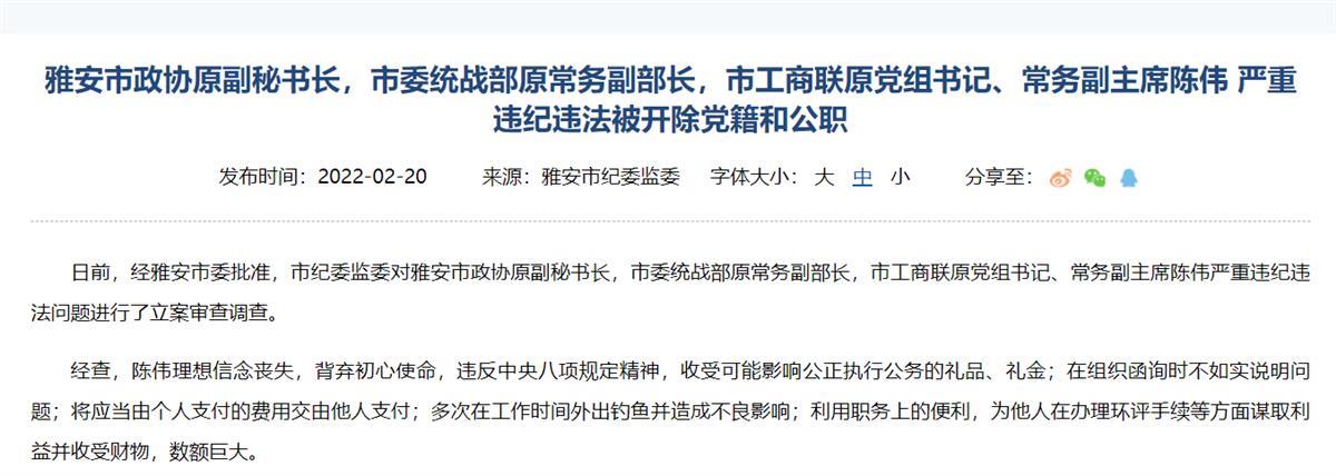 基层头条讯:2月20日,四川省雅安市纪委监委网站通报,日前,经雅安市委批准,市纪委监委对雅安市政协原副秘书长,市委统战部原常务副部长,市工商联原党组书记、常务副主席陈伟严重违纪违法问题进行了立案审查调查。